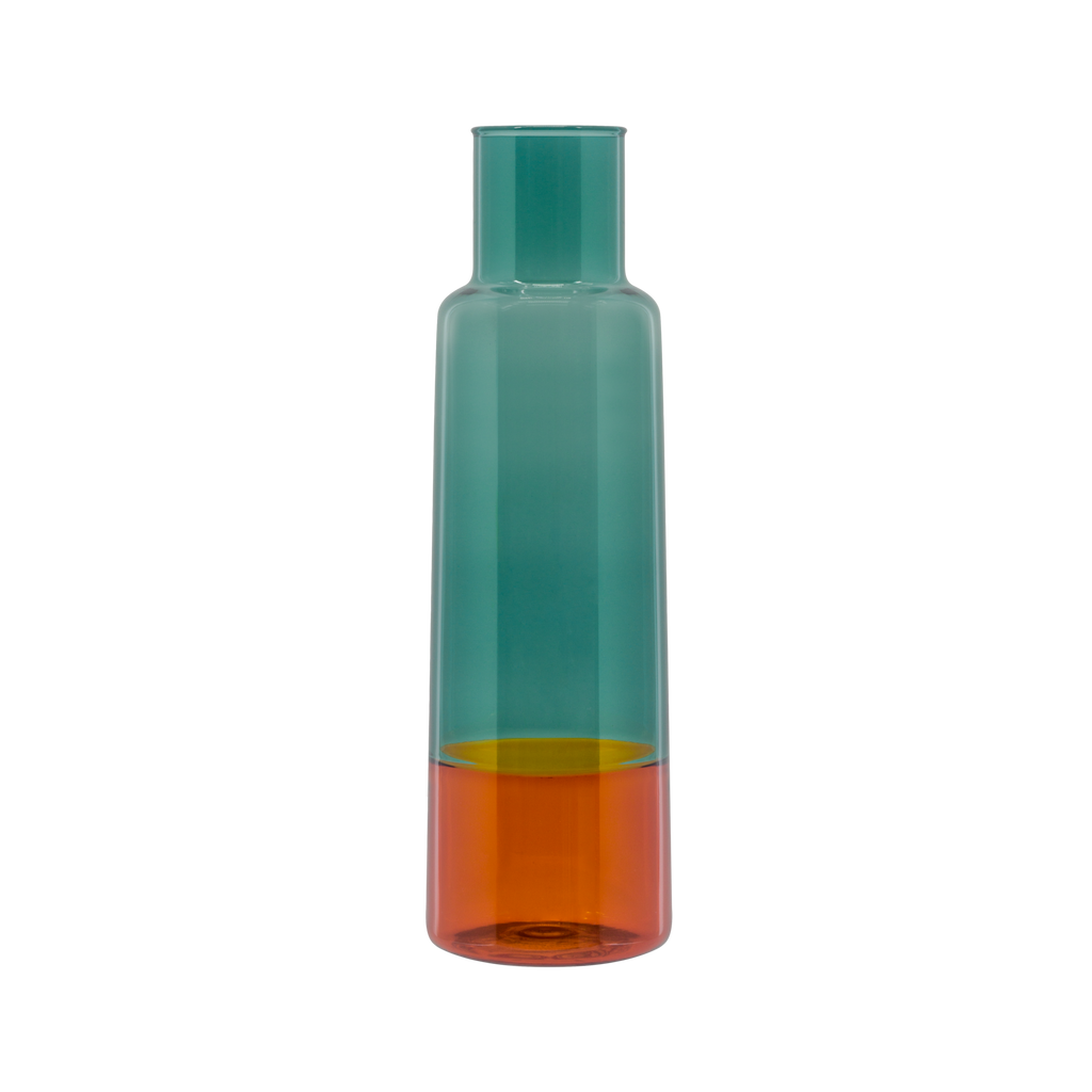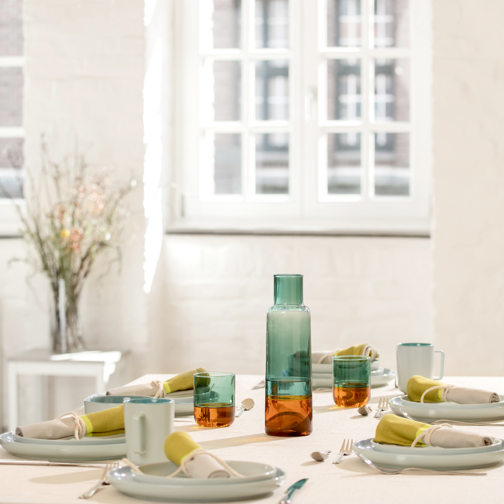 Elegante Karaffe, die dem alltäglich gedeckten Tisch eine stilvolle Note verleiht. Da das Gefäß aus Borosilikatglas gefertigt wird, ist es fein, leicht und gleichzeitig sehr stabil und temperaturwechselbeständig. Extrem kalte oder heiße Temperaturen können der Karaffe nichts anhaben. Mit Getränken gefüllt, ändert sich die Farbgebung und ein charmantes Farbenspiel entsteht.