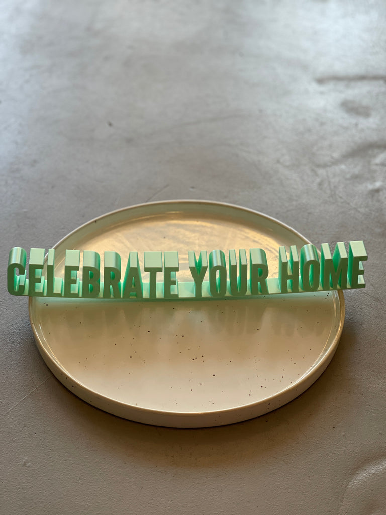 Schriftzug "Celebrate your home" – Leicht, modern und nachhaltig in 3 verschiedenen Farben zum Aufstellen als Dekoobjekt, als Anhänger zum Deko / Interiorgeschenk, etc. Die etwas andere Dekoration.