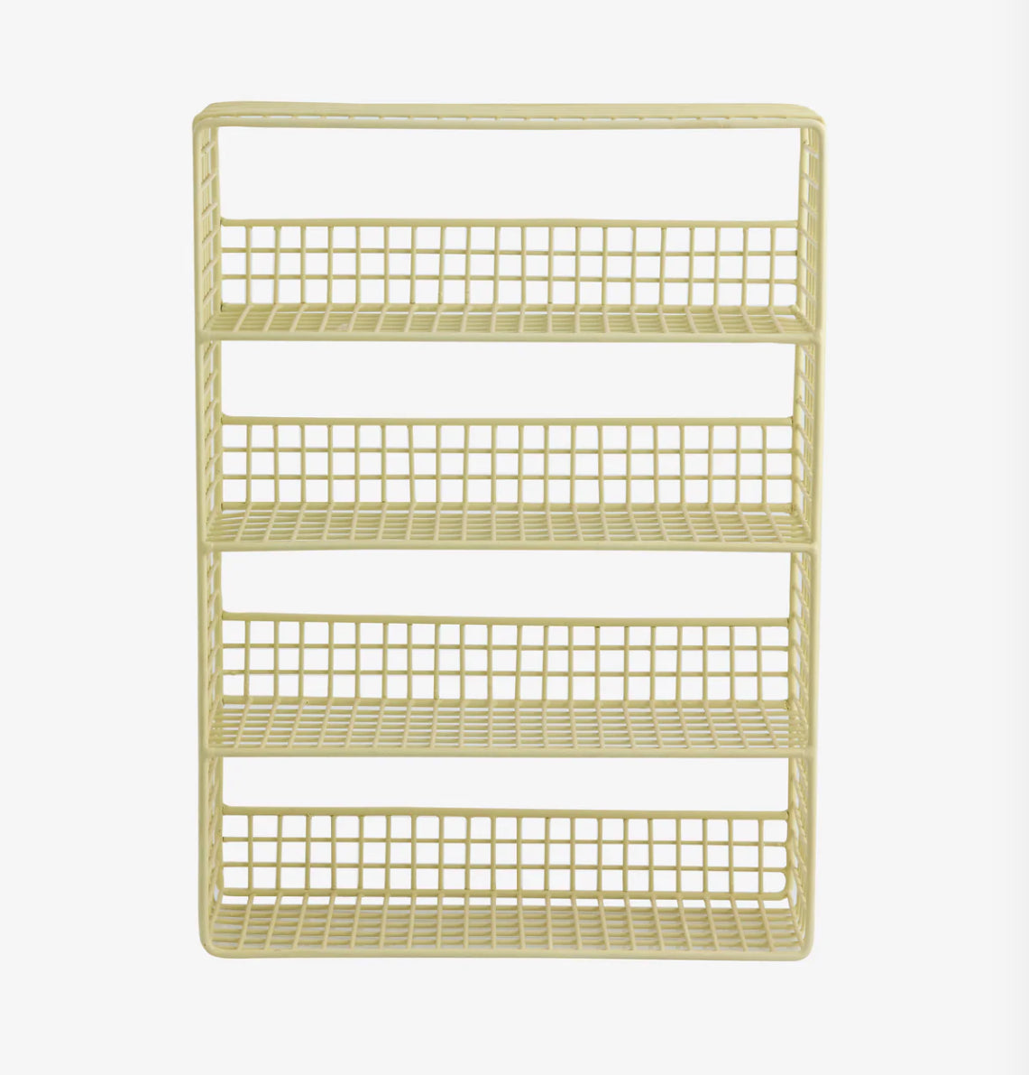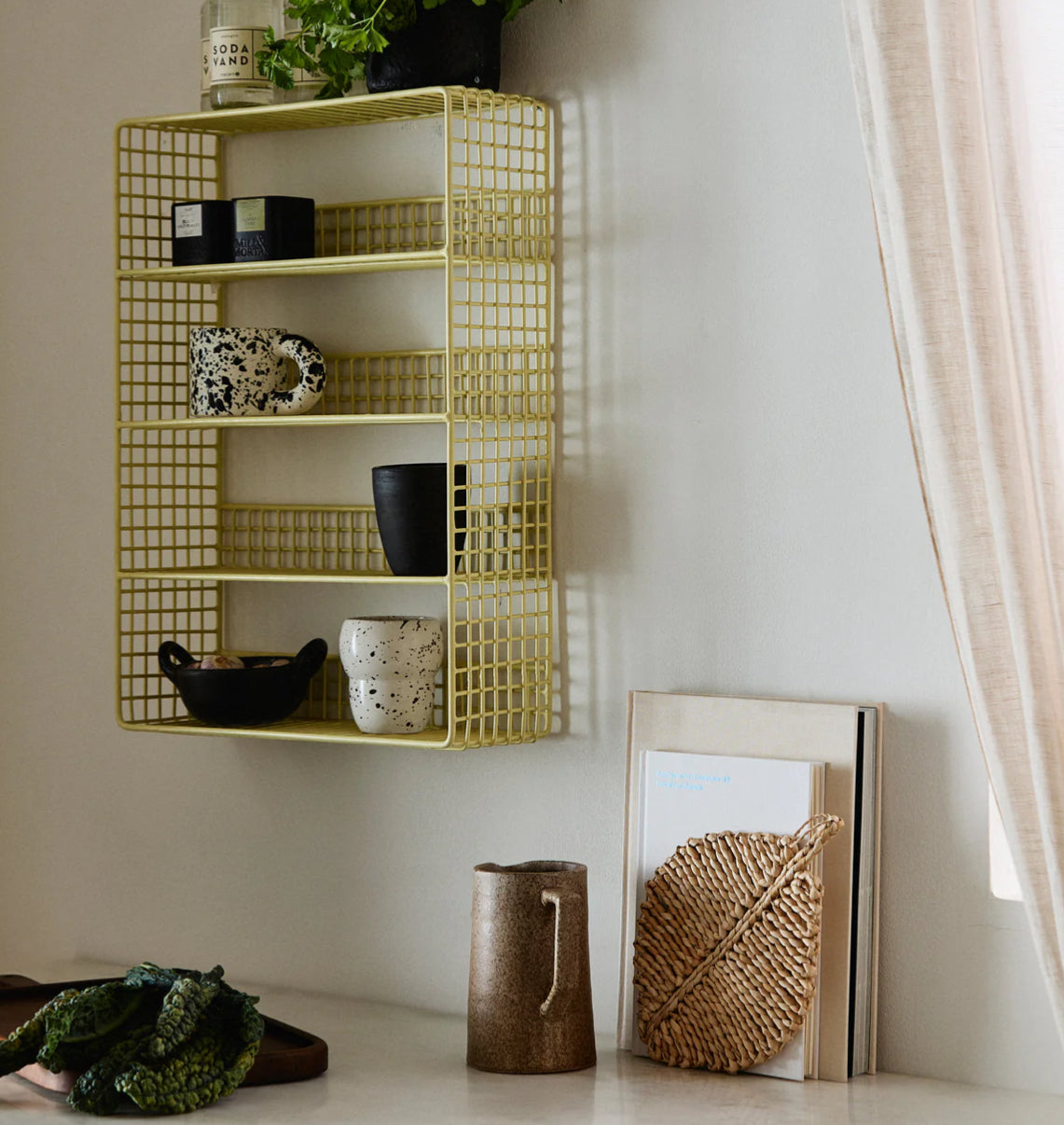 Das KIKORI-Regal besteht aus einem Metallgitter mit einer gelb pulverbeschichteten Oberfläche. Das offene Design ermöglicht es Ihnen, Ihre Sammlung von Keramiktassen, Lieblingsfundstücken oder anderen dekorativen Accessoires elegant zu präsentieren, während das stromlinienförmige Design einen schönen und eleganten Rahmen für Ihre Sammlung bietet Artikel.
