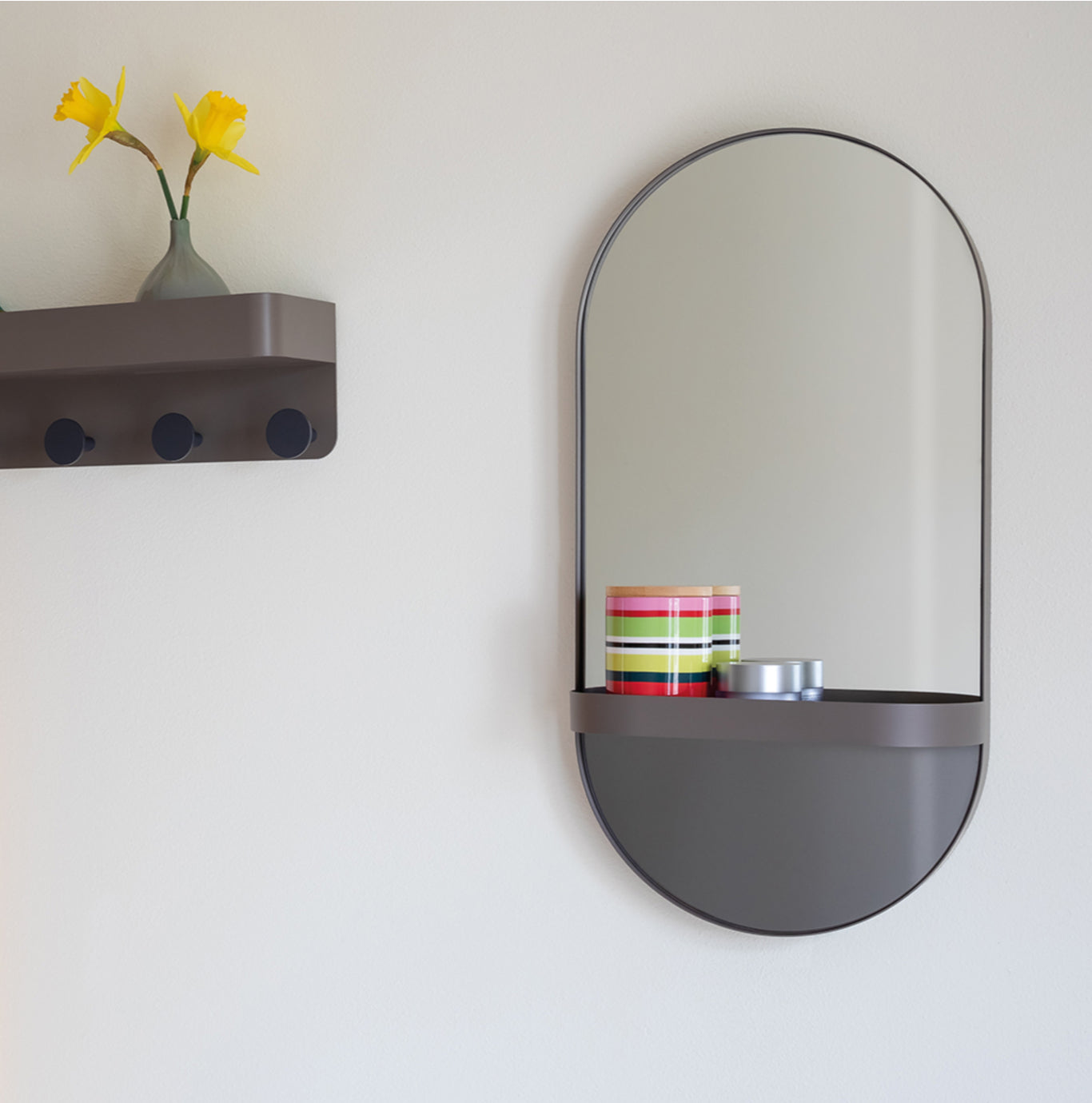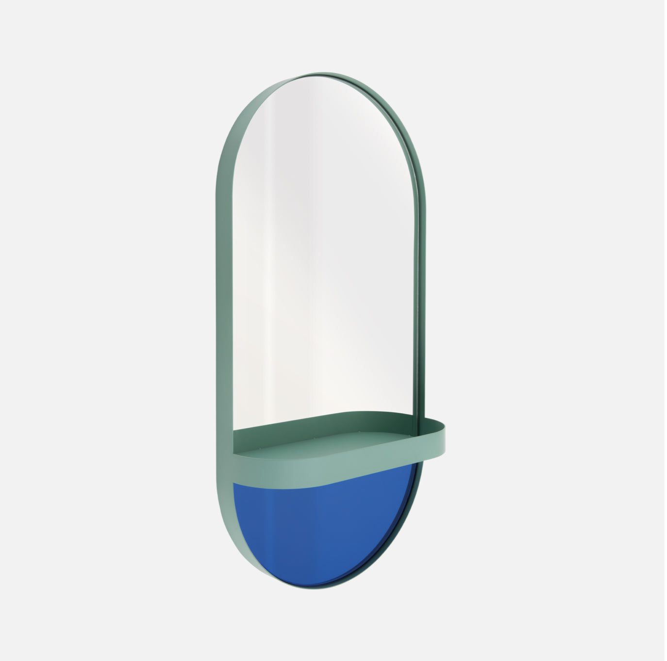 Dieser Wandspiegel überzeugt durch seine schöne Form und das teilweise eingefärbte Spiegelglas, das durch die integrierte Ablage von der Spiegelfläche aus Klarglas abgegrenzt wird. Daraus entsteht ein optimales Zusammenspiel aus Funktion und Ästhetik, das Akzente setzt. Die Ablage ist nicht nur eine optische Unterteilung, sondern bietet im Bad auch Platz für Parfum, Lippenstift und Zahnbürste oder im Flur für Handy, Schlüssel und Portemonnaie.